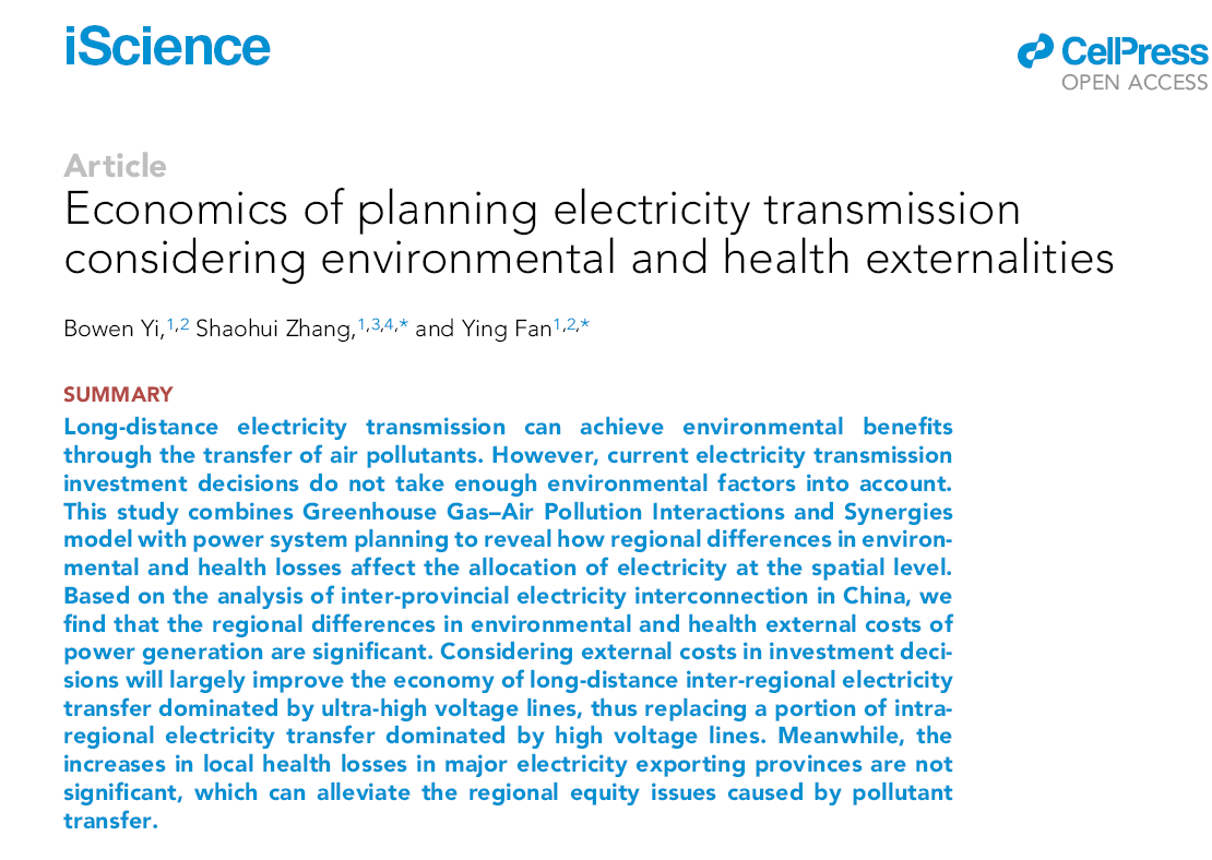 近日,Cell子刊《iScience》(交叉科学)刊发实验室最新研究论文“Economics of Planning Electricity Transmission Considering Environmental and Health Externalities”。衣博文副教授为该论文的第一作者,张少辉副教授和范英教授为共同通讯作者。该成果受到了国家重点研发计划“应对全球变化的可持续性转型模式研究”和国家自然科学基金创新研究群体项目“绿色导向的社会经济复杂系统管理决策”的资助。(全文免费下载网址http://doi.org/10.1016/j.isci.2022.104815)