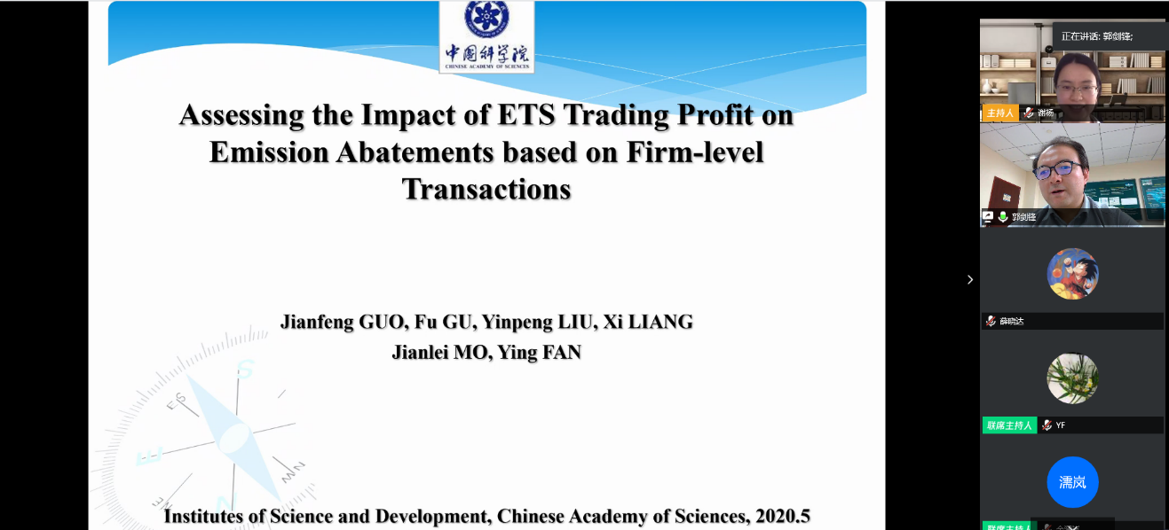 2020年5月12日下午3:00,中国科学院科技战略咨询研究院郭剑锋研究员以腾讯会议在线直播的形式,做了题为“欧盟碳市场交易收益对企业减排的影响:基于大数据的分析”的讲座。北航经济管理学院谢杨副教授主持讲座,经济管理学院范英院长、中心研究人员及师生等105人参加了讲座。