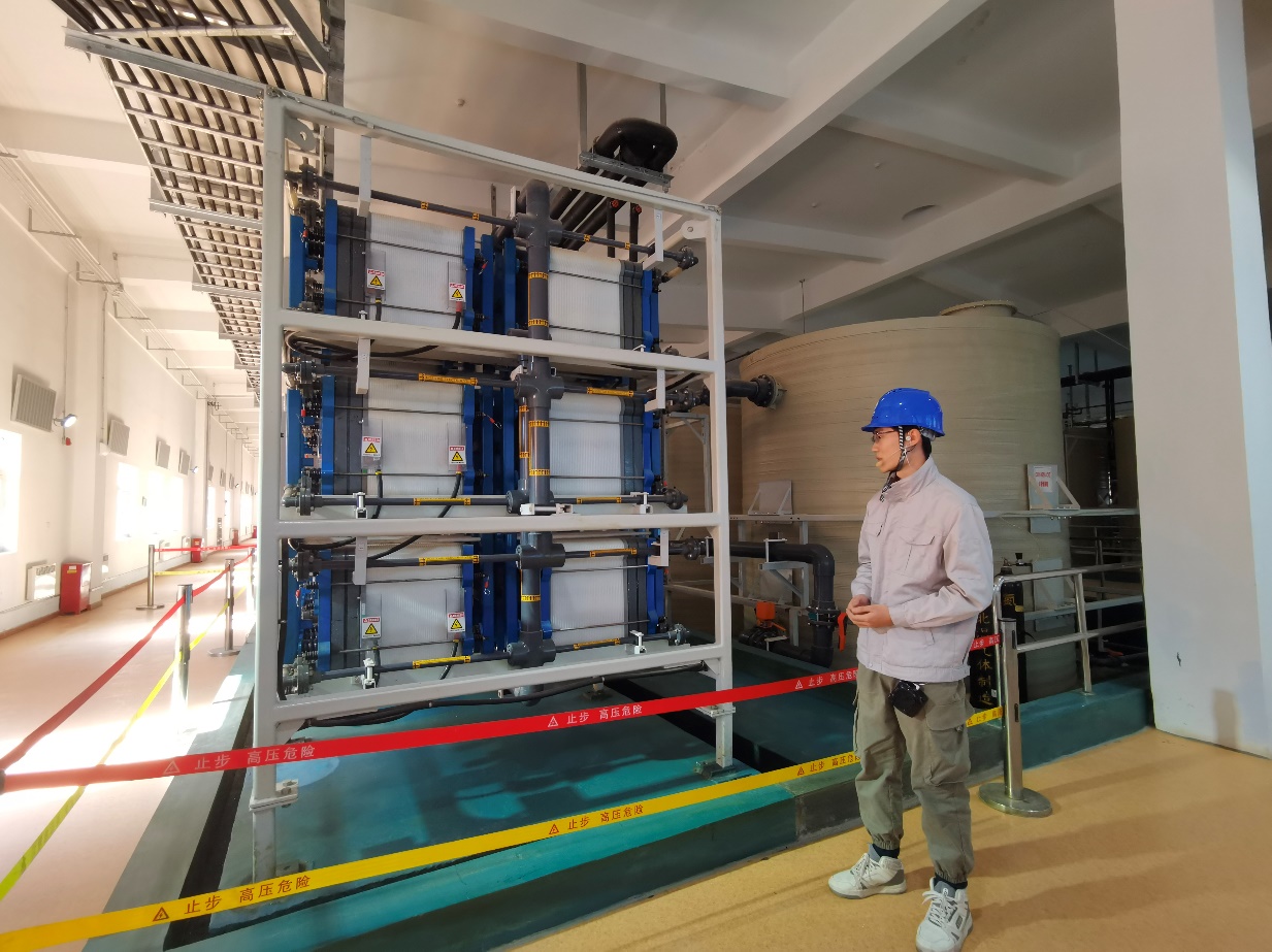 专业实训活动首先从光伏电站开始。在基地老师的介绍下,同学们逐渐认识了光伏发电的不同跟踪方式和多种类型的电池板及其转化效率,并走近电池板真切地观察、感受光伏设备。随后,同学们来到基地内部,参观储能电站4号厂房。该厂房储能系统采用的是全钒液流电池,相比起路边的光伏板和风塔,这样的储能设备在同学眼中更是新鲜,基地老师向我们介绍厂房中的设备以及液流电池的性能区别,同学与老师积极提问,受益匪浅。下午,同学们近距离参观了95米风塔,在高耸的风塔下,聆听着华北平原呼啸的风声与风塔内的刹车声,感受着能源的涌动,也感受着建设的不易。