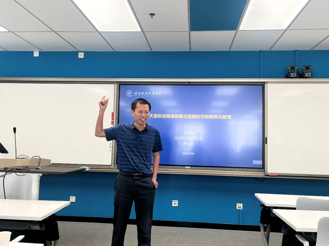 北航交通科学与工程学院唐铁桥教授根据国家自然科学基金重点项目研究成果,进行了题为大型机场离港旅客交通组织与协同优化管理的学术报告,挖掘机场各交通要素的交互机理及耦合关系,研究机场运行资源及旅客交通组织运行规律,结合“平安、绿色、智慧、人文”四型机场要求,提出旅客离港交通组织优化方案。