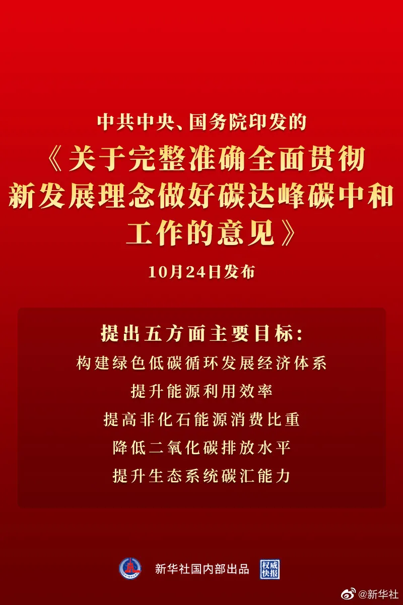 【低碳转型要闻】 中共中央、国务院印发《关于完整准确全面贯彻新发展理念做好碳达峰碳中和工作的意见》《2030年前碳达峰行动方案》 IEA《2021年世界能源展望》:世界能源革命正在上演,但过于缓慢