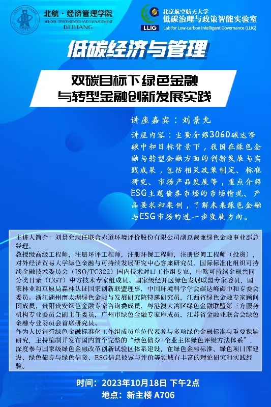 讲座预告:刘景允 《双碳目标下绿色金融与转型金融创新发展实践》