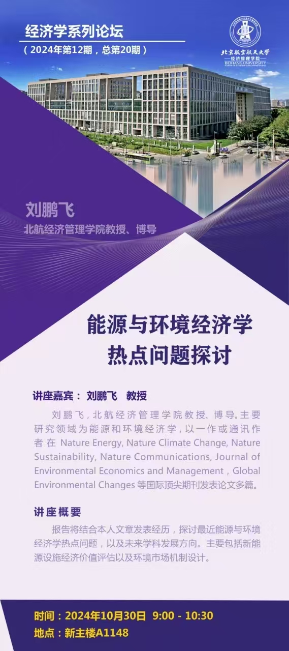 讲座预告:刘鹏飞教授《能源与环境经济学热点问题探讨》