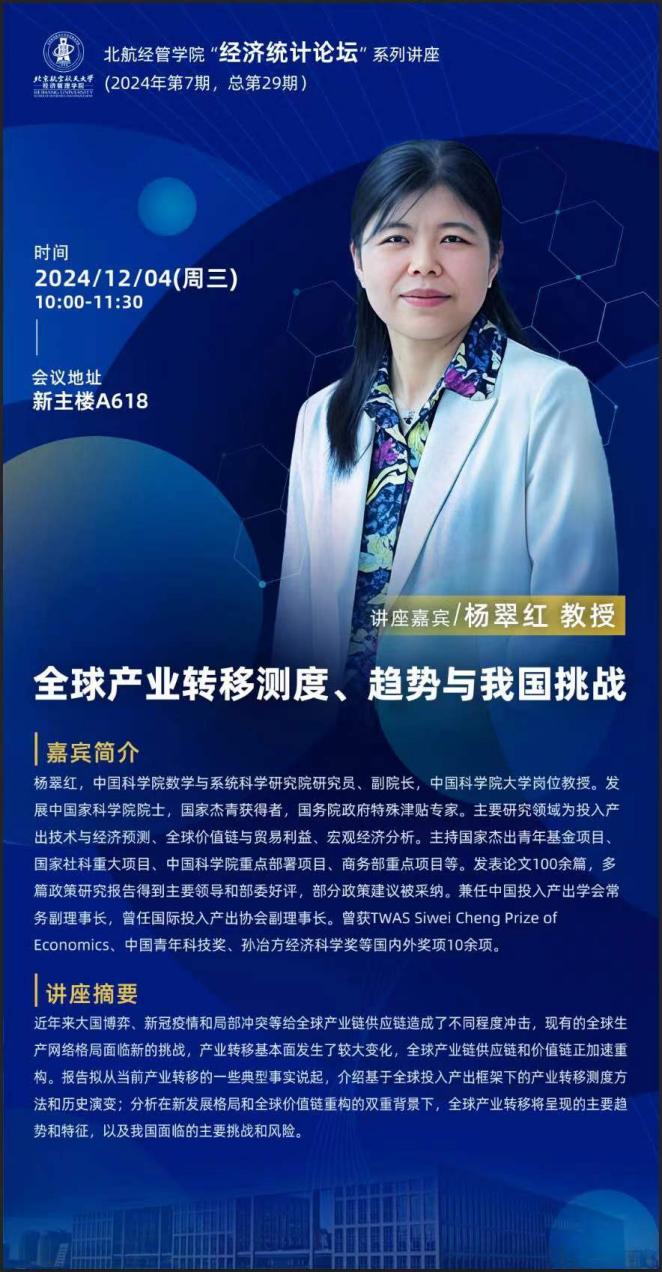 讲座预告:杨翠红教授《全球产业转移测度、趋势与我国挑战》