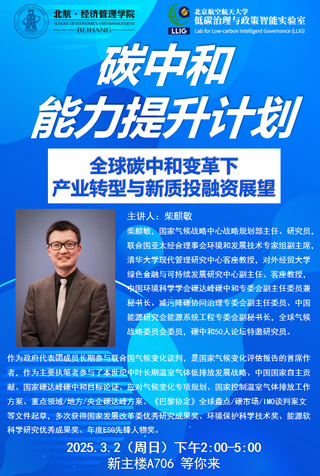 讲座预告:柴麒敏主任《全球碳中和变革下产业转型与新质投融资展望》