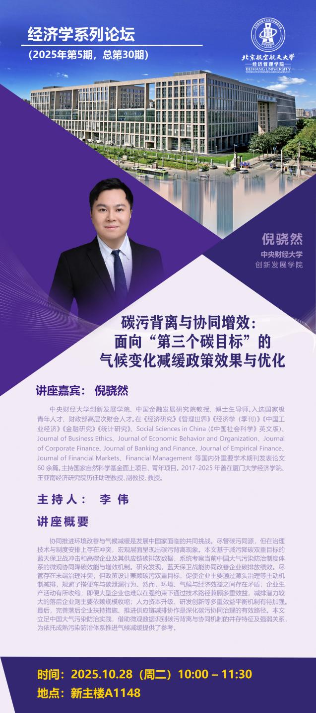 讲座预告:倪骁然教授《碳污背离与协同增效: 面向“第三个碳目标”的气候变化减缓政策效果与优化》