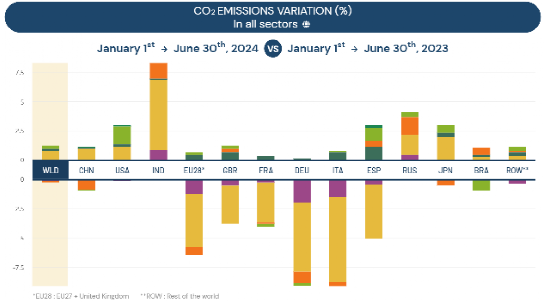 按时间纵向对比来看,全球2024年前6个月总碳排放水平较上年同期增加约2.1亿吨(210Mt),其中发电部门碳排放对排放增加贡献最大(0.8%),工业和居民部门则有少量降低。全球主要经济体中,美国碳排放较去年同期增幅2.9%,其中陆地交通碳排放贡献最大;中国碳排放较去年同期增幅0.3%,其中发电部门碳排放增加0.477亿吨,工业部门碳排放减少0.44亿吨;印度碳排放较去年同期增加1.2亿吨,其中发电部门碳排放增加高达0.877亿吨;欧盟主要国家碳排放明显减少,平均降幅为5.7%;俄罗斯(+4.2%)、日本(2.4%)等国家也有一定增长。