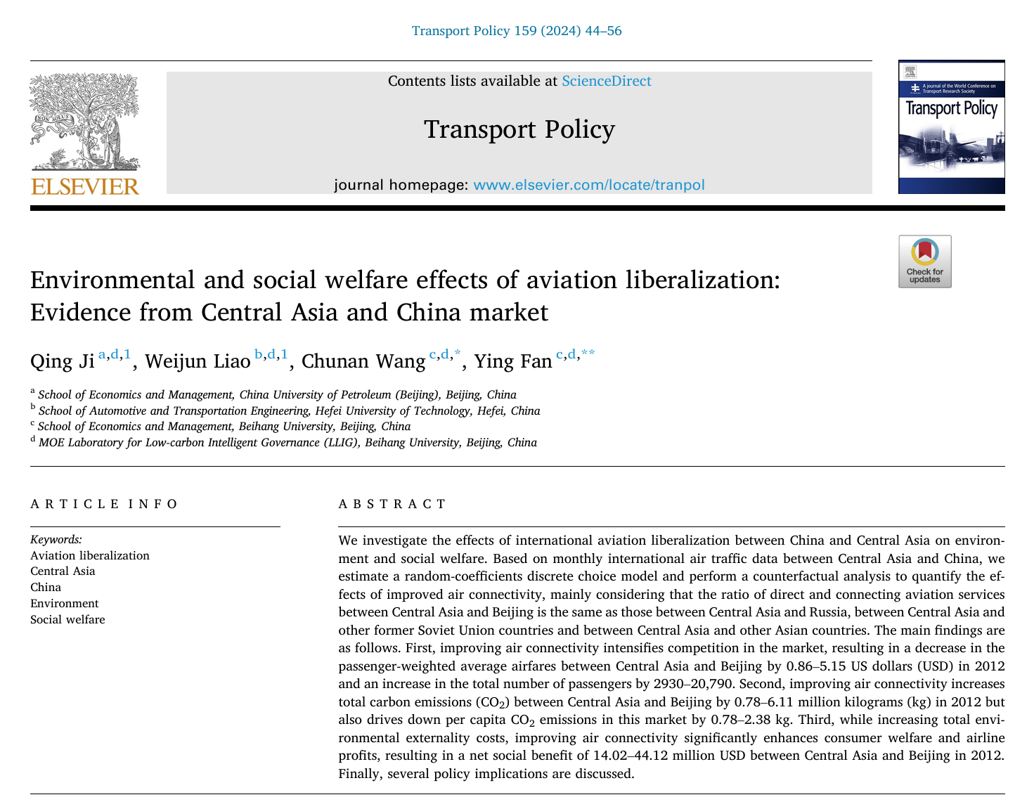 题目:航空自由化对环境和社会福利的影响:来自中亚和中国市场的证据