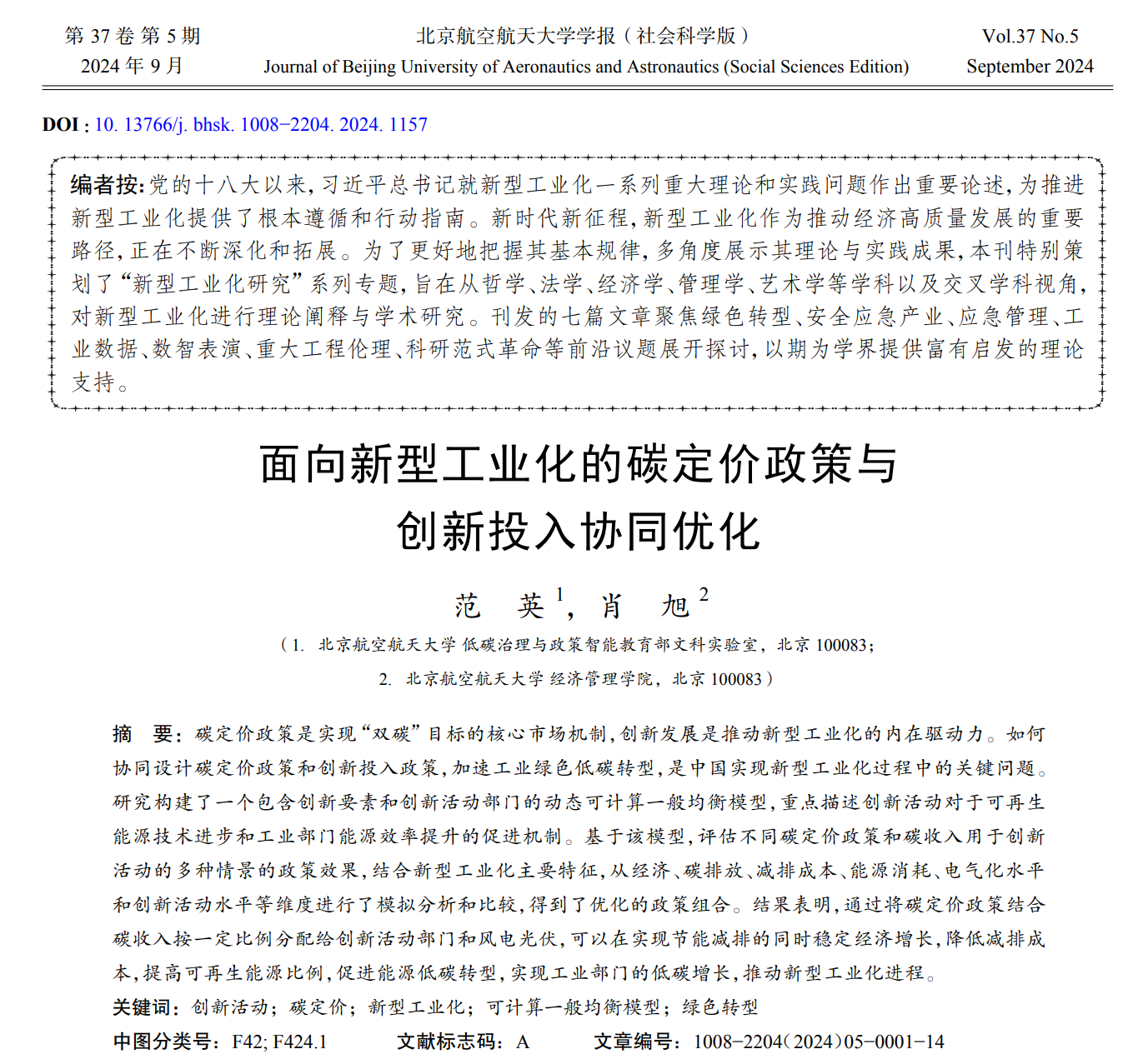 题目:面向新型工业化的碳定价政策与创新投入协同优化